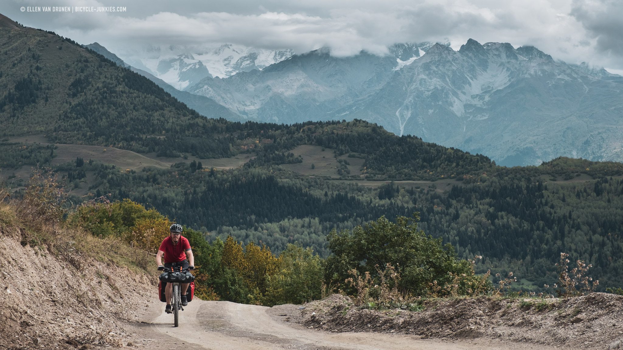 As we reach the start of the 4×4 track it immediately skyrockets up the hill. But, anything for a great view of Mount Ushba and the many glaciers. As we slowly push our bikes up the hill, the clouds start to roll in. Sections are between 13 and 18% and more and most of it we have to walk up. By lunch time we have only managed to gain 400 altimeters, but we won’t give up!