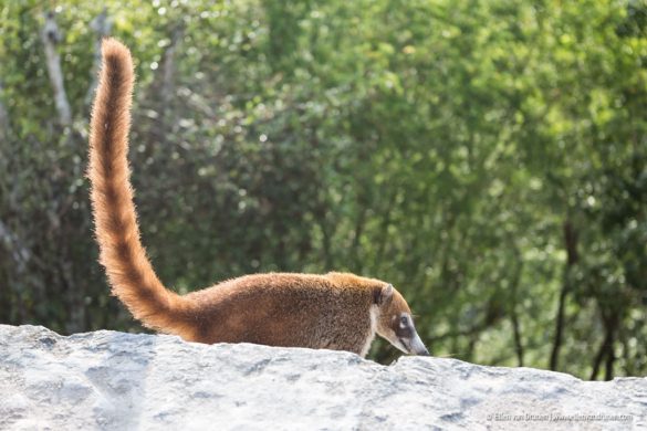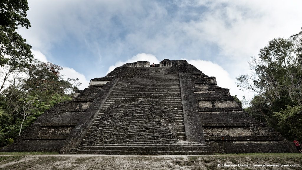 The alarm clock wakes us at 5 AM, the gates will open at 6 and we want to visit the site before the crowds arrive. In the early moring we spot Spider Monkeys in the trees towards the ruins and birds, such as tucans fly around. We follow Dieters advise and make our way to Temple IV, which you are still allowed to climb. From here you can see the tallest and steepest of all Maya temples (Temple II) poking it’s head through the dense forrest. The sun is hiding behind foggy clouds, but still, it’s a great overview and we are the only ones enjoying this magnificent view!