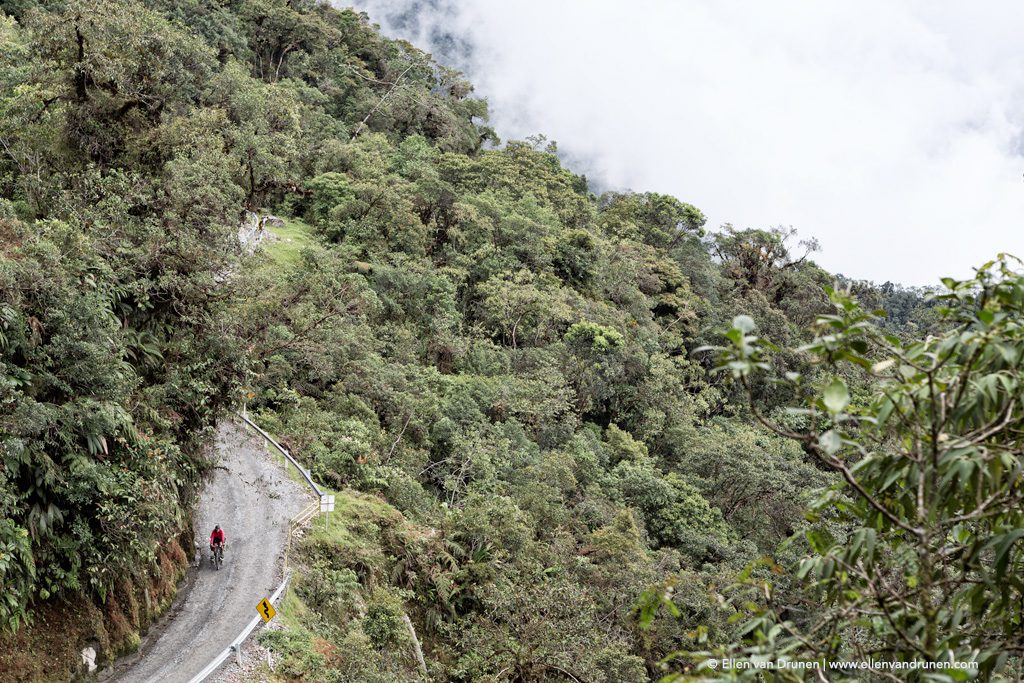 We find ourselves on the Trampolina de la Muerte; a narrow and unpaved track that will lead us from the mountains to the jungle. It’s hot, drops of sweat are running down my face into my eyes. Our shirts are completely soaked and the little midgies just love the smell of hard work.