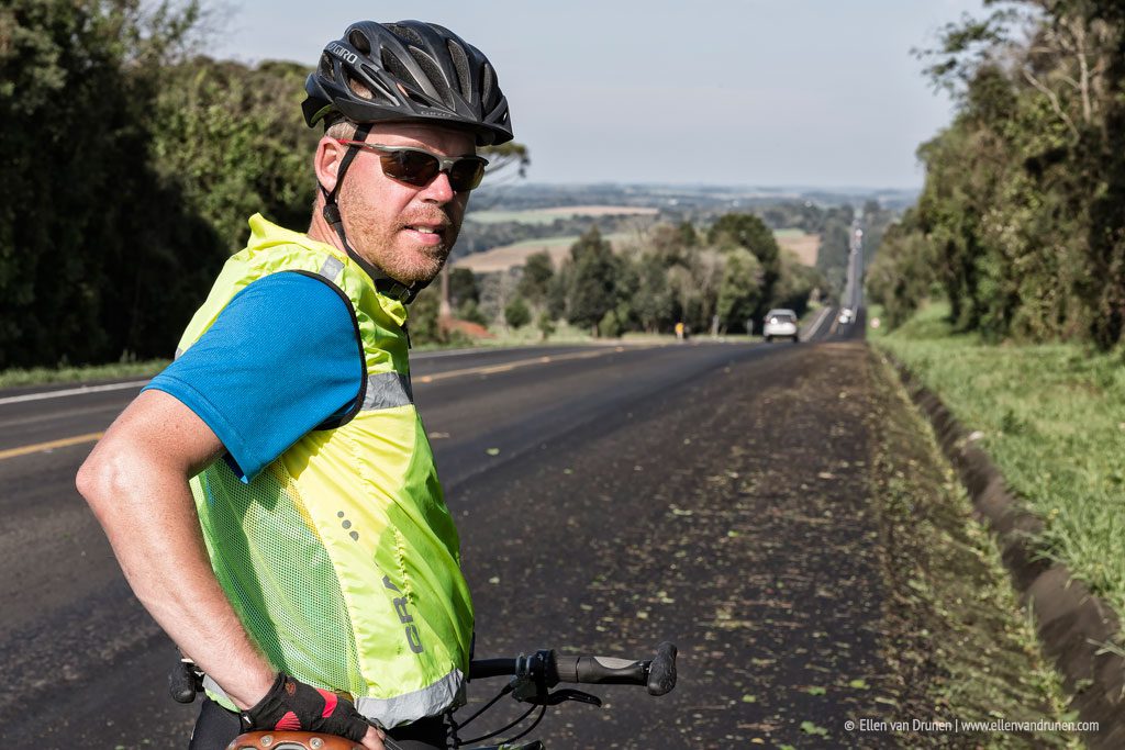 We stay at the coast for a while and then turn inland, it’s hot and humid and very little traffic so far. We hear tropical birds and eat fruit at roadside restaurants, so far the Brasilians are very friendly to us and wave a lot. The rolling hills are something different.. and pretty tough! But there always seems to be at least one shoulder, so we keep switching sides to stay safe, because no matter what, we have to cycle on the highway. At night we often camp at gas stations and during the day we drink free coffee at toll booths on the BR-277. In the mean time the weather has changed, temperature dropped to 15 degrees and it’s raining! For lunch we eat at buffet livres; for less than 4 euro all you can eat and we can eat a lot!